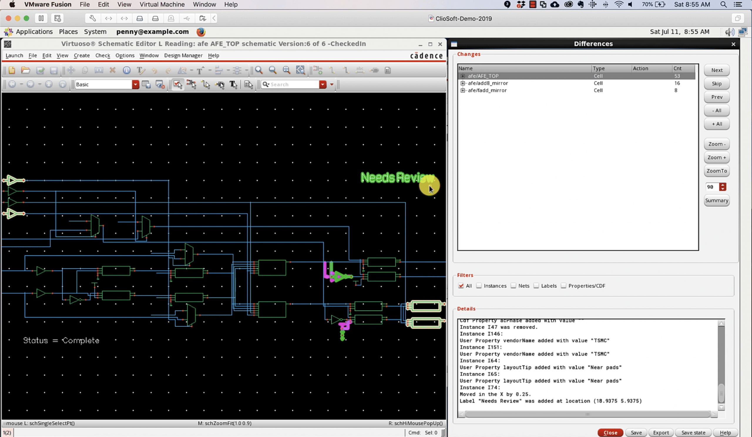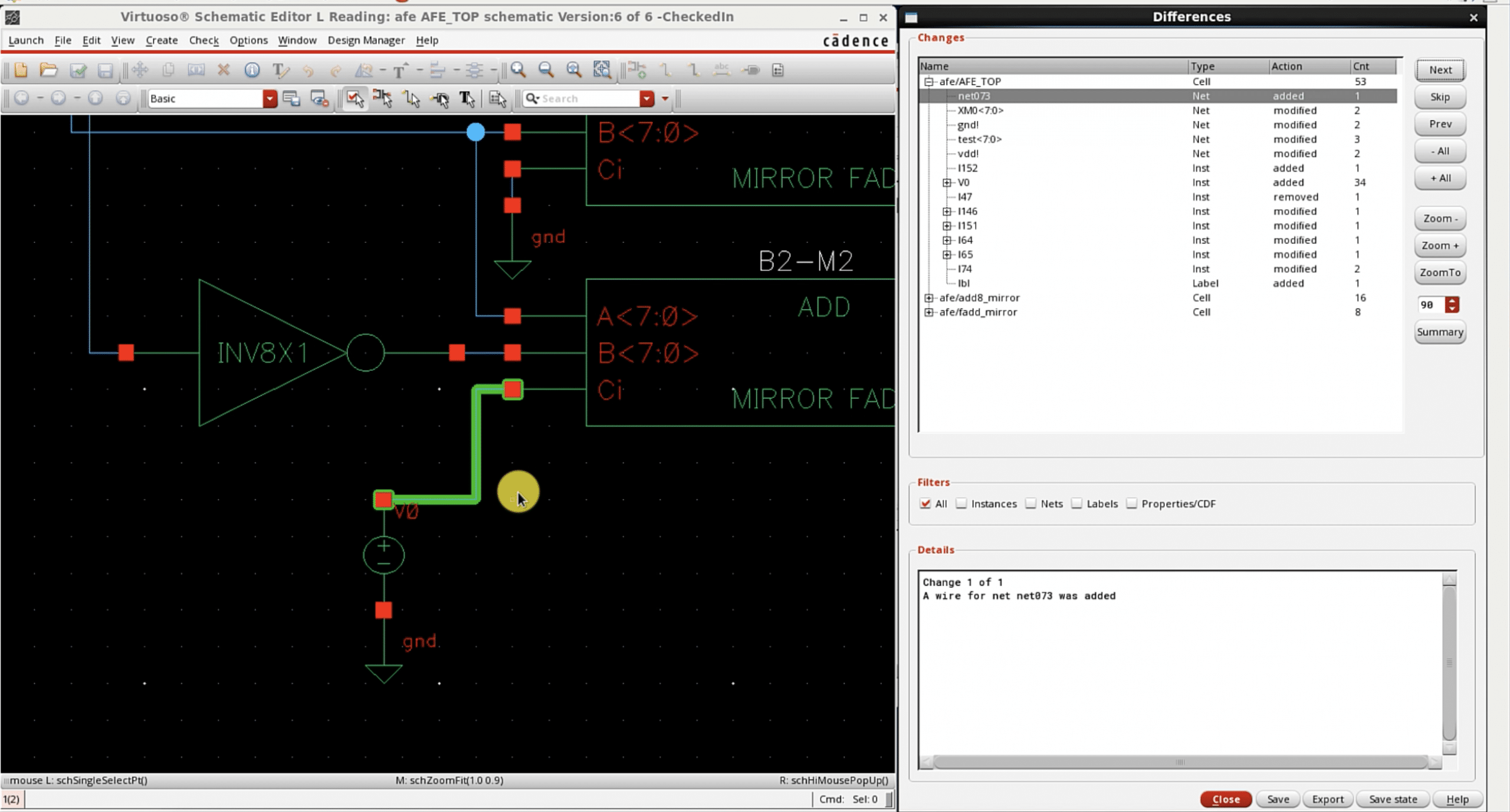 Cliosoft VDD helps schematic and layout engineers using Cadence® Virtuoso® Platform to collaborate and ensure that the latest schematics and layouts are 100% in sync. A schematic engineer can make changes to the schematic without keeping notes to report to the layout engineer. The layout engineer can see all the changes precisely without any help from the designer and can modify the layout to match the latest schematic changes.